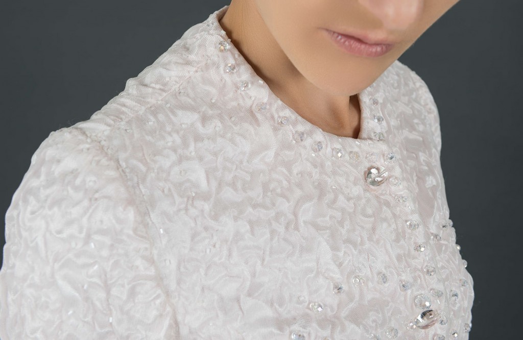 • Details: satin, tulle, no appliqués, solid colour, hand beaded detailing, crystals, fringes, round collar, single-breasted , button closing, pockets, long sleeves, lined interior