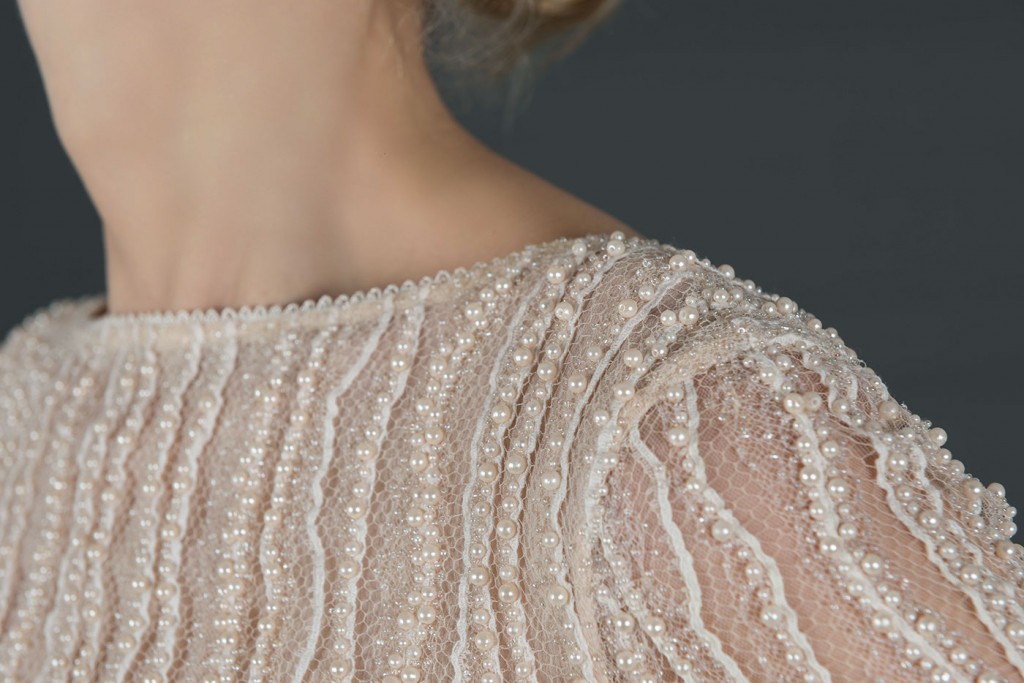 - Details: lace, tulle, no appliqués, solid colour, hand beaded, italian lace, pearls, tiny micro beads, round collar, rear closure, zip closure, long sleeves, lined interior